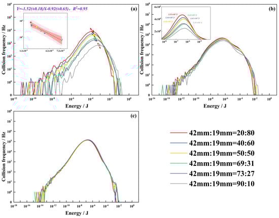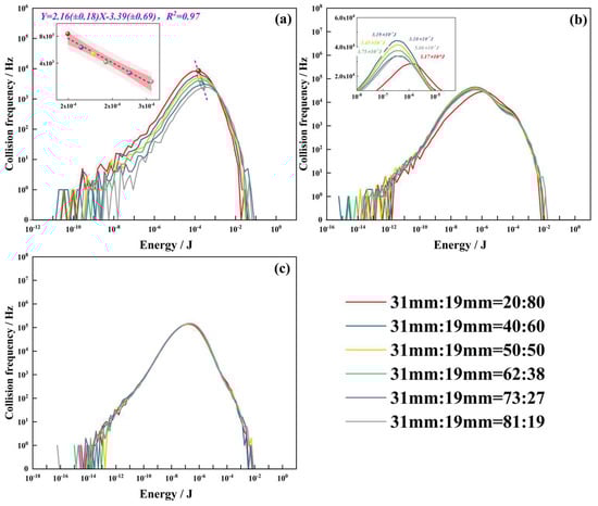 As shown in Figure 9, the simulation results depict the collision energy distribution for the medium sizes of 31 mm and 19 mm under different ratios. Figure 9a, Figure 9b, Figure 9c represent the collision energy distributions for B-B, B-P, and P-P, respectively. Firstly, it can be observed that there are significant differences in collision energy distribution between media under different grinding conditions. As the proportion of smaller ball diameters increases, the collision frequency gradually increases. This can be explained by the fact that reducing the medium size significantly increases the number of media particles at the same filling ratio, directly affecting the collision frequency.