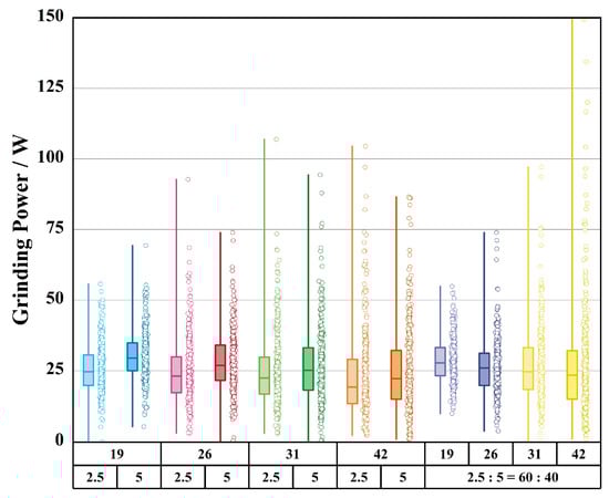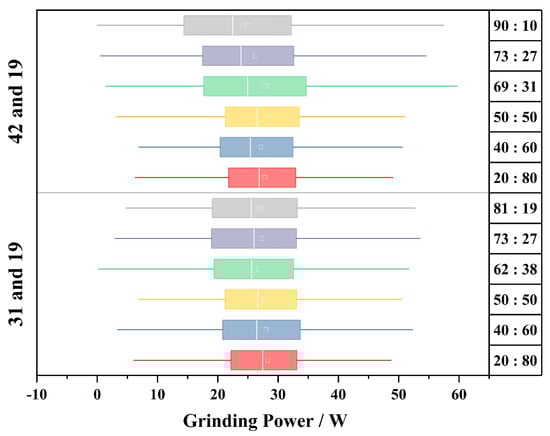 Furthermore, we compared the grinding energy consumption under different medium ratios. As shown in Figure 12, we observed that as the proportion of small media increased, the grinding energy consumption also increased, regardless of whether it was 42 mm and 19 mm or 31 mm and 19 mm. However, in contrast to Figure 11, we did not observe significant fluctuations in grinding energy consumption due to an increase in average medium size. Instead, the variation in grinding energy consumption was not substantial, regardless of the medium ratio.