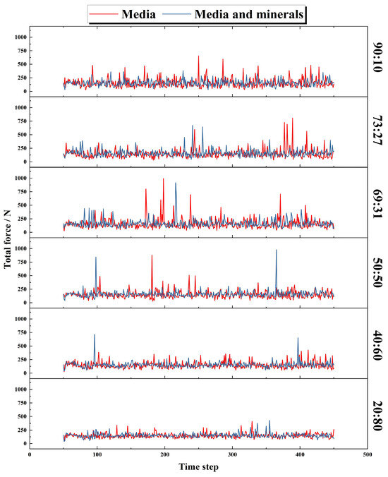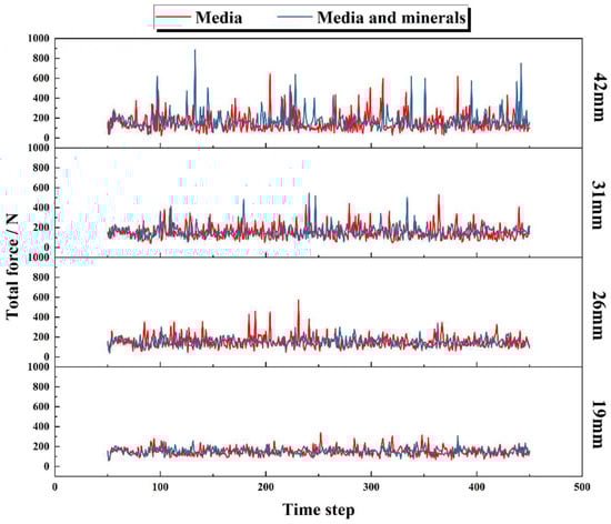 As shown in Figure 13, we compared the effects of media size on the liner under conditions with and without minerals. It can be observed that as the media size increases, the total force exerted on the liner increases significantly, reaching its maximum at 42 mm. In the case of 19 mm media, the average total forces with and without minerals are 153 N and 149 N, respectively. For 42 mm media, the average total forces with and without minerals are 170 N and 154 N, respectively. This indicates that increasing the media size increases the total force exerted on the liner, and the presence of minerals significantly amplifies this effect. Furthermore, it can be observed that as the media size increases, the total force exhibits greater fluctuations over time. Therefore, it can be concluded that the forces acting on the liner are closely related to the media size.