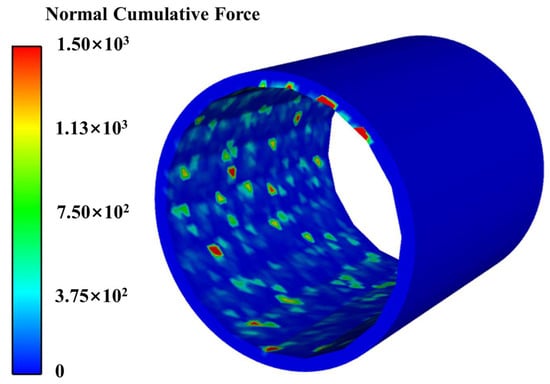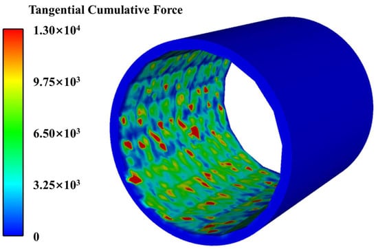 Considering that the grinding process occurs in a three-dimensional space, the forces acting on the liner include normal forces and tangential forces. Figure 15 and Figure 16 show the cumulative normal and tangential forces acting on the liner under the condition of a 42 mm:19 mm = 50%:50% media ratio with minerals. By comparing both, it can be clearly observed that the cumulative normal forces exerted on the liner are dispersed, while the cumulative tangential forces cover the entire liner. This is directly related to the motion of the various particles during the grinding process. Normal forces are mainly generated when the media impacts the liner like raindrops, while tangential forces are mainly caused by the friction between the particles and the liner during the lifting process. Additionally, it can be observed that the cumulative tangential forces are significantly greater than the cumulative normal forces, indicating that the lifting process of the particles causes considerable wear on the mill liner.