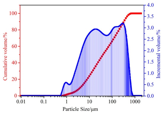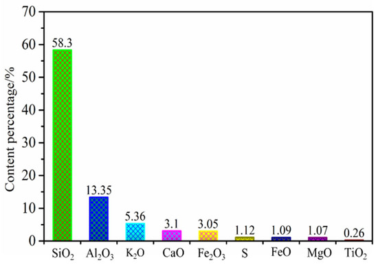 In this study, the unclassified tailings from a gold mine in Yantai City, Shandong Province, China, were selected as a case study. The basic physical properties are described in Table 1, and the size distribution curve of the unclassified tailings particles is displayed in Figure 1. It can be observed that the cumulative content of particles with a diameter smaller than 10.0 μm is approximately 24%, and the cumulative content of particles with a diameter smaller than 20.0 μm exceeds 37%. The main chemical compositions in the unclassified tailings are shown in Figure 2. As shown, the content of SiO2 is 58.3%, which is the main component, indicating that the tailings have good inertness and are suitable for stockpiling. The contents of Al2O3, K2O, and CaO are 13.35%, 5.36%, and 3.1%, respectively, which can promote the solidification of the slurry and improve the later strength of the solidified modified tailings. The content of S is 1.12%, which is relatively low and can enhance the strength of solidified modified tailings to a certain extent [50].