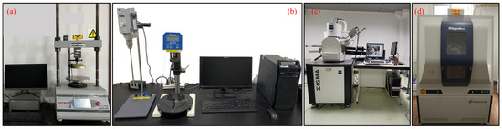 Experimental equipment. (a) Humboldt HM-5030 load testing machine; (b) Brookfield RST-SST Rheometer; (c) Zeiss SIGMA SEM; and (d) X-ray diffractometer.