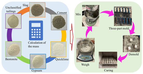 According to the number of samples and the total mass required for the experiment, combined with the information in Table 3, the mass of each material was calculated. We used the JS30-1 electronic balance (with a range of 3 kg and accuracy of 0.1 g), Shanghai Puchun Measure Instrument Co., Ltd., Shanghai, China, to measure the corresponding masses of each material. We mixed the materials in a UJZ-15 planetary mixer for 3 min (rotation speed of 120 r/min) and then poured the mixed slurry into the three-part mold (each part size was 7.07 cm × 7.07 cm × 7.07 cm). After a certain period, the samples were demolded and placed in a standard curing chamber. The temperature was set at 20 ± 5 °C and the relative humidity was above 95%. The samples were left to cure for 7 d, 14 d, and 28 d (including the time before demolding), and then their compressive strength was tested. The process is illustrated in Figure 4. In this study, we produced 192 samples.