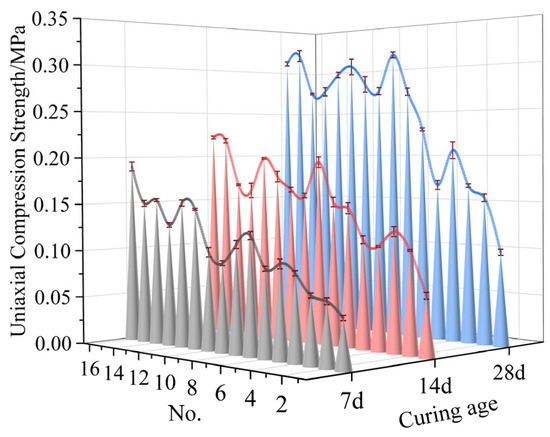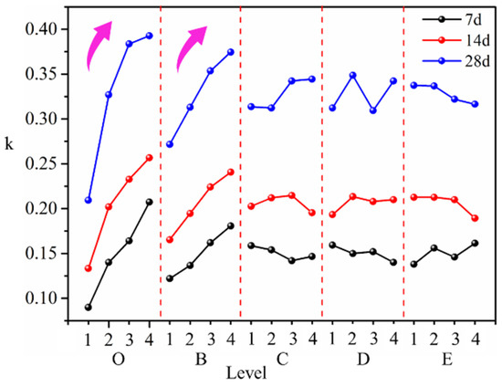 Table 4 shows the range analysis results of the orthogonal experiments, which were found according to the data in Table 3 and Figure 5 It can be observed that the influence of various factors on the compressive strength of the samples at 7 d and 14 d follows the order of O > B > E > D > C, and the influence of various factors on the compressive strength of samples at 28 d follows the order of O > B > D > C > E, indicating that the compressive strength was primarily affected by the slurry concentration and the proportion of quicklime. Based on the test results, the optimal combination proportions of the materials in the curing agent at different curing ages are shown in Table 5.