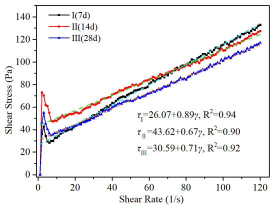 The rheological parameters of the modified tailings slurries were tested based on the three curing agent proportions above. In this study, the curing agent proportions corresponding to the best flowability were identified as the optimal proportions. The rheological characteristics of the three modified tailings slurries are illustrated in Figure 7. As shown, the regression curves of the flow curves for the modified tailings slurries I (7 d), II (14 d), and III (28 d) were represented by blue, green, and orange dashed lines, respectively. The regression equations for the flow curves of the modified tailings slurries Ⅰ (7 d), Ⅱ (14 d), and Ⅲ (28 d) were, respectively, τⅠ = 26.07 + 0.89γ, τⅡ = 43.62 + 0.67γ, and τⅢ = 30.59 + 0.71γ, and all R2 values were greater than 0.90, indicating that all three modified tailings slurries adhered to the Bingham fluid model. The yield stresses of the slurries were 26.07 Pa, 43.62 Pa, and 30.59 Pa, and the viscosity coefficients of the slurries were 0.89 Pa·s, 0.67 Pa·s, and 0.71 Pa·s, respectively.
