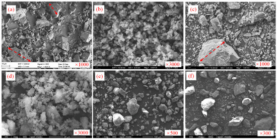 As shown in Figure 8a, slag particles primarily exhibit cubic, blocky, and irregular shapes, with distinct edges and a dense texture. The particle sizes range from approximately 1 to 10 μm. Nanoscale particles are attached to the surface of larger particles, which appear relatively smooth. Figure 8b reveals that the particles of quicklime are mainly clustered, forming uniform-sized crystal branches. The size of each branch is smaller than 1 μm, and they aggregate to form structures ranging from 1 to 10 μm, characterized by a rough surface with occasional protrusions. The aggregated structures formed by the branches appear loose and porous. Figure 8c illustrates that cement particles exist in various forms, including blocks, rods, spheres, cubes, and irregular shapes, displaying substantial shape variation. Nanoscale particles are attached to the surfaces of larger particles (size > 2 μm), leading to rough surfaces on the larger particles. Rod-like particles have dimensions of approximately 2 μm × 10 μm, and their surface roughness lies between that of the larger and spherical particles. In Figure 8d, gypsum is primarily present in flocculent, small-particle, large-block, and irregular forms. Flocculent small particles exhibit multiple protrusions and a rough surface. Figure 8e shows that most bentonite particles exhibit circular, elliptical, or similar circular shapes, with rough surfaces and sizes ranging from a few micrometers to tens of micrometers. Figure 8f demonstrates the varied sizes of the unclassified tailings particles, with the largest particle in the image measuring about 200 μm × 300 μm. The majority of particles have sizes below a few micrometers, some even in the nanometer range. In addition, most of the tailings appear as flakes, and it can be seen that the surface of the tailings is rough.