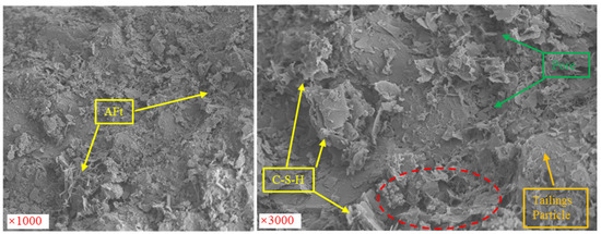 Figure 9 illustrates the cross-sectional morphology of the modified tailings solidified samples with the optimal curing agent. It can be observed that after the reaction, the various materials were fused together as a whole, and the sharp edges of the material particles disappeared. Additionally, the disappearance of the quicklime morphology indicates that the quicklime underwent a full reaction. The surfaces of some tailings particles were involved in the hydration reaction, and the rest is wrapped by the hydration products. The tailings particles that were not fully reacted, as shown by the brown arrow, acted as a skeleton, and supported the strength of the solidified samples. The hydration products were mainly AFt (prismatic ettringite) and C-S-H [51,55]. The appearance of a flocculent gel system can be observed; some gel systems exhibited clear spatial structures, as indicated by the red dashed line. The green arrows indicate the pore structure. These characteristics enhanced the strength of the solidified sample. Comprehensive analysis revealed that effective reactions occurred between the curing agent and the unclassified tailings, resulting in gel systems and spatial structures, thereby enhancing the overall strength of the solidified system and achieving effective solidification of the unclassified tailings.