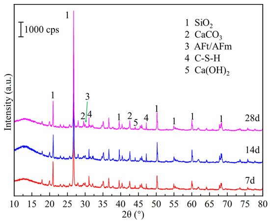 Further experimentation revealed that the average uniaxial compression strength values of the modified unclassified tailings solidified samples with the optimal curing agent were 0.20 MPa, 0.25 MPa, and 0.34 MPa at 7 d, 14 d, and 28 d, respectively. We conducted XRD tests on these MUTSSs at different curing ages to further analyze the chemical reaction mechanism of each material in the curing agent. Figure 10 shows the XRD patterns of the MUTSSs at 7 d, 14 d, and 28 d. The diffraction peaks corresponding to C-S-H, AFt, Ca (OH)2, CaCO3, and SiO2 can be seen in the figure [51,55]. Figure 11 illustrates the qualitative relationships among the main hydration products. As shown, with the extension of the hydration time, the contents of AFt and Ca (OH)2 decreased, while the content of C-S-H increased. This phenomenon is consistent with the conclusions reported by Jha et al. [56], Telesca et al. [24], Yum et al. [25], and Li et al. [26].