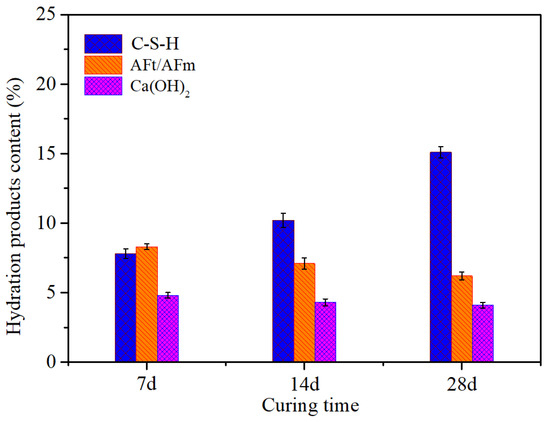 When the curing time was 7 days, the AFt content was the highest, followed by C-S-H and Ca(OH)2. At the initial stage of hydration, more AFt crystals formed, and C-S-H gel grew on the cement particles. Due to the growth of C-S-H and the formation of AFt crystals, strong and weak contact points were generated. At the same time, the hydration product particles connected to form a network, giving the solidified samples early strength. As the number of contact points increased, the size of the network structure increased, and consequently, the strength of the solidified samples increased. The combination of the hydration products, tailings, and unhydrated clinker is the reason for the observed early macroscopic strength. After 28 d of curing, the content of C-S-H was the highest, followed by AFt and Ca(OH)2. At this time, the strength of the solidified samples was the highest. This observation can be explained as follows: After 28d of hydration, a significant amount of C-S-H was generated, enhancing the long-term strength and durability of the solidified samples. Due to the abundant presence of C-S-H and the complete formation of AFt and Ca(OH)2 crystals, hydration products filled the space previously occupied by water. The spatial distribution of the hydration products was uniform and gradually interwoven, ultimately forming a dense multi-layered network structure, which increased the overall compressive strength. The above phenomena and analysis are consistent with the research presented in Section 2, and are a supplement to the theoretical analysis in Section 2, reflecting the phased nature of the curing reaction process.