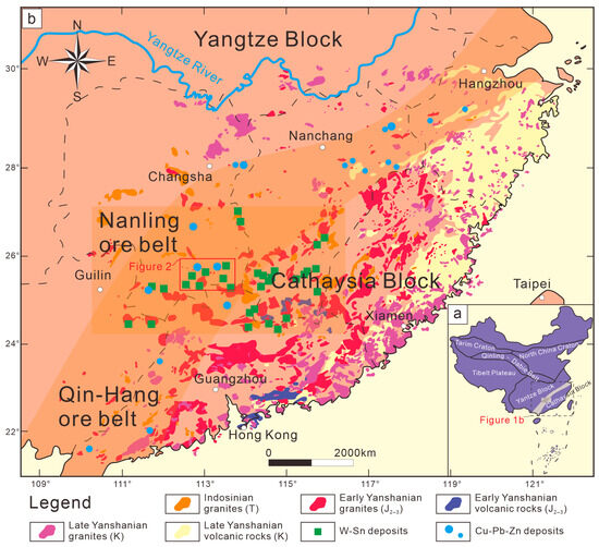 (a) Sketch map of the regional tectonic framework. (b) Distributions of the Jurassic granites and deposits in the South China Block. Modified from Zhou et al. [36].