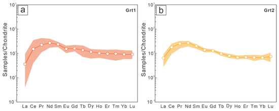 REE distribution pattern of Grt1 (a) and Grt2 (b) from the Baoshan deposit, chondrite-normalized according to the literature [55].