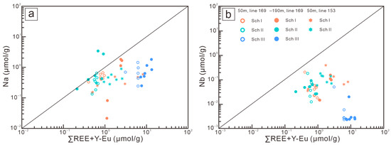 Most spots of Sch I and Sch II fall near the 1:1 correlation line, with Na increasing alongside ∑REE + Y-Eu (Figure 14a). This suggests a Na-REE coupled substitution mechanism. However, a few spots deviate from this line, indicating that REEs might enter the scheelite lattice via the replacement of Ca site vacancies. The insufficient concentration of Na (average 13.5 ppm) and the weak correlation between Na and ∑REE + Y-Eu (Figure 14) [2] suggest that the Ca site vacancy substitution mechanism may be dominant. Sch III falls far below the 1:1 correlation line, further indicating the Ca site vacancy mechanism (Figure 14a). Figure 14b also supports this, showing low Nb and high ∑REE + Y-Eu concentrations across the three generations of scheelite. In this case, REEs of any size can enter the scheelite lattice in pairs without preference. Given the weak influence of other factors on the REE pattern [56], the REE pattern in scheelite from the Baoshan deposit likely reflects the composition of the ore-forming fluid during its precipitation [58].