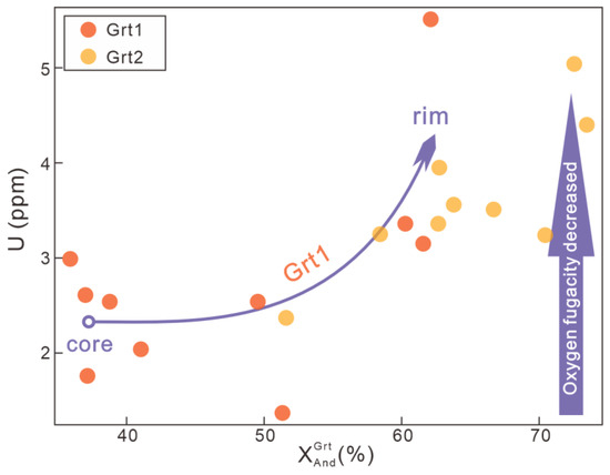 The composition of pyroxene in Baoshan is predominantly diopside, indicating that the mineralizing hydrothermal fluids during the early skarn stage were generally under high oxygen fugacity conditions [59]. Additionally, changes in the U content in garnet can indicate variations in the oxygen fugacity of the mineralizing fluids, as low oxygen fugacity conditions tend to increase the U content in garnet [60,61]. The U content in Grt1 shows an increasing trend from the core to the rim; in Grt2, the U content is significantly higher than in Grt1 (Figure 15). This indicates that the oxygen fugacity of the mineralizing fluids during the early skarn stage gradually decreased.