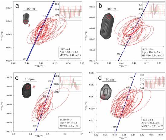Zircons from coarse–medium-grained monzogranites (18ZB-39-3) are predominantly colorless, transparent, and well-crystallized, with grain sizes ranging from 100 to 150 μm. The CL images show a homogeneous composition and well-developed typical magmatic rhythmic zones (Figure 4c). Twenty analyzed zircons cluster on the concordant line, yielding a 206Pb/238U weighted age of 395 ± 3 Ma (MSWD = 1.3, N = 20) (Figure 4c), which is interpreted as the crystallization age of the granites. Zircons exhibit a comparably limited range of εHf(t) values, ranging from +1.5 to +8.5, and produce TDMC model ages in the range of 1032 to 1666 Ma (Supplementary Table S3).