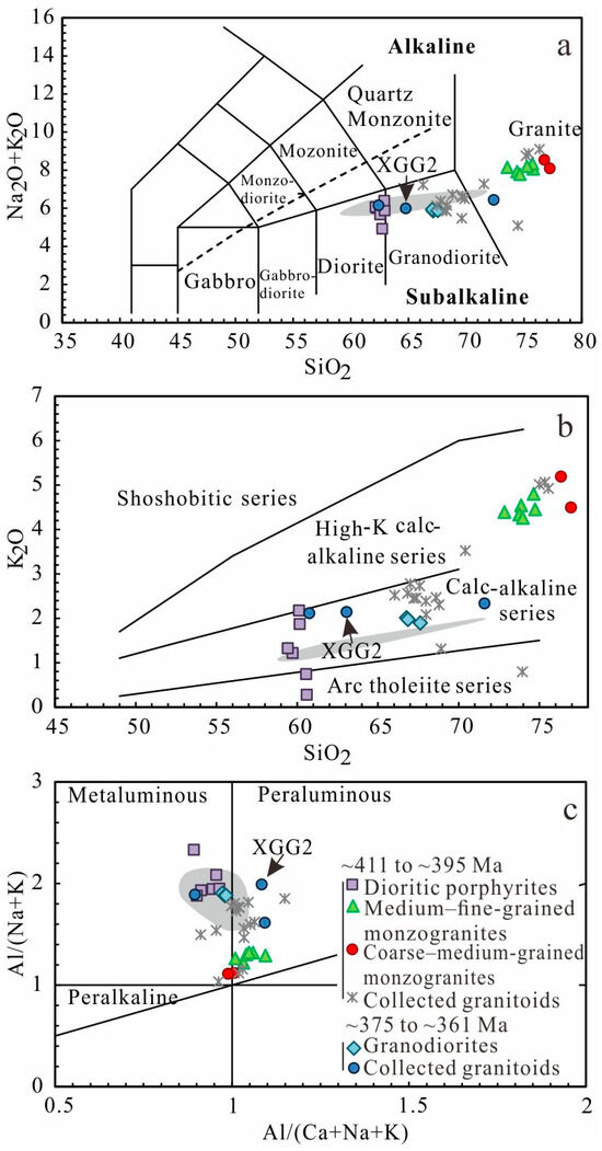 Devonian magmatism in the Kumishi area occurred in two major stages of ~411–395 Ma (Early Devonian) and ~375–361 Ma (Late Devonian) (Figure 2; Supplementary Table S1) [42]. This study reveals that dioritic porphyrites, along with medium–fine-grained and coarse–medium-grained monzogranites, were formed during the period of ~411 to ~395 Ma (Early Devonian), while granodiorites fall within the period of ~375 to ~361 Ma (Late Devonian).