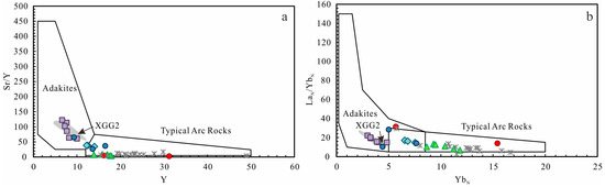 The complied granitoids fall into the low-K to high-K calc-alkaline series (Figure 5b) and display metaluminous to peraluminous compositions (Figure 5c). Additionally, they exhibit negative HFSE anomalies, LILE enrichment, and strong depletion of Nb-Ta-Ti anomalies (Figure 6d), indicating their arc-related tectonic setting. As illustrated in Figure 10, the granitic rocks are plotted within the VAG field. Among these granitoids, only XGG2 is identified as adakite; the rest are categorized as I-type granites (Figure 7) [39].
