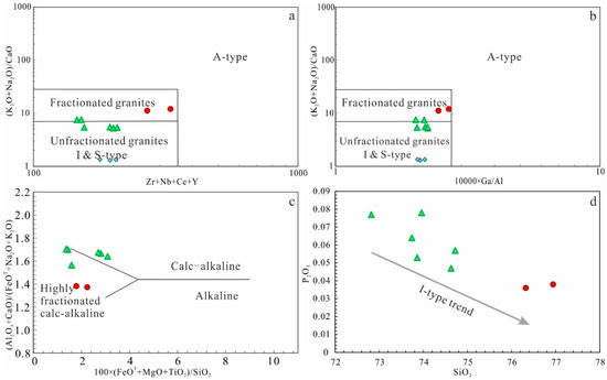 Diagrams of (a) (Na2O + K2O)/CaO vs. Zr + Nb + Ce + Y and (b) (Na2O + K2O)/CaO vs. 10, 000 × Ga/Al [81]; (c) 100 × (FeOT + MgO + TiO2)/SiO2 vs. (Al2O3 + CaO)/(FeOT + Na2O + K2O) [82]; and (d) P2O5 vs. SiO2 [83] for granitic and dioritic intrusive plutons within the Kumishi region. The symbols are as in Figure 5.