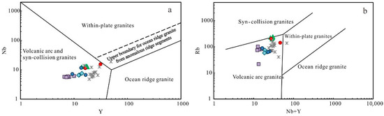 Tectonic discrimination plots for granitic and dioritic intrusive plutons within the Kumishi region, including (a) Y vs. Nb and (b) Y + Nb vs. Rb [89] (the data for compiled magmatic rocks are listed in Supplementary Table S5). The symbols are as in Figure 5.