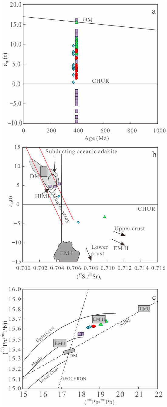 (a) Age vs. εHf(t) diagram, (b) εNd(t) vs. initial (87Sr/86Sr)i diagram, and (c) 206Pb/204Pb vs. 207Pb/204Pb diagram for the granitoids in the Kumishi area. DM, depleted mantle; EMI and EMII, enriched mantle; HIMU, mantle with high U/Pb ratio; NHRL, Northern Hemisphere reference line. The symbols are as in Figure 5.