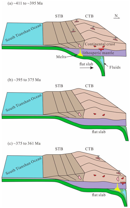 These findings enable the construction of a tectonic framework for the CTB and STB, which provides a comprehensive explanation for all the geological developments of the Devonian (Figure 12). During the period of ~411 to ~395 Ma (Figure 12a), the initiation of flat subduction of the South Tianshan oceanic crust generated adakites and a suite of arc-related volcanic and granitic intrusions. As flat-slab subduction persisted, the flat segment of the slab extended, causing intracontinental contractional deformation, crustal thickening, and the gradual exclusion of the asthenospheric mantle wedge, resulting in a magmatic lull during ~395 to ~375 Ma (Figure 12b) [2,3,4,5]. During ~375 to ~361 Ma (Figure 12c), the flat slab lost its stability and initiated progressive rollback along the northern margin of the CTB, generating adakites and arc-related volcanic and granitic intrusions.