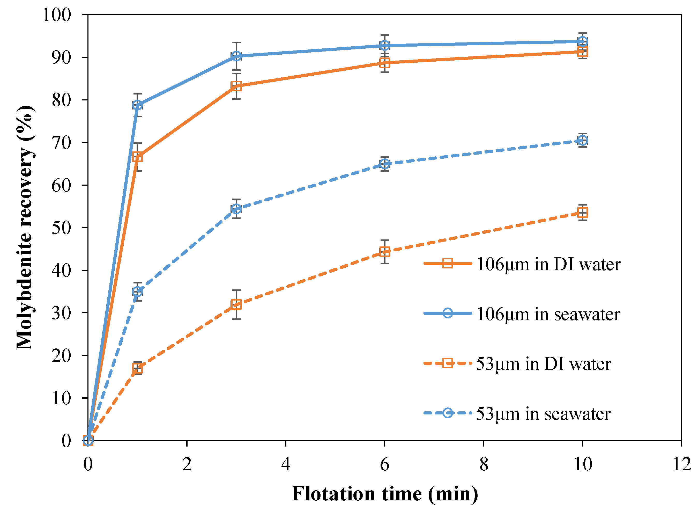 - Chen, Y.; Chen, X.; Peng, Y. The effect of sodium hydrosulfide on molybdenite flotation in seawater and diluted seawater. Miner. Eng. 2020, 158, 106589. [Google Scholar] [CrossRef]