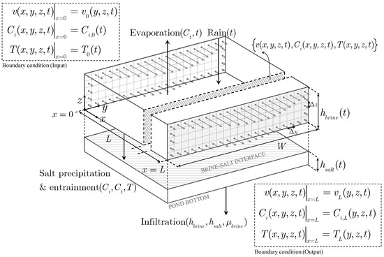 In the figure, velocity arrows indicate how the pond corners trap brine, increasing residence time, and species’ local concentrations (shades of gray). At the same time, the figure shows the length and width of the pond and how the brine is fed and discharged. The depth of the ponds is small, usually less than 1 m. Gradients in concentration also occur in the vertical direction and a layer of solid precipitates will form when the brine concentration reaches the crystallization point of some of the salts. Because the heat capacity of the brine decreases with concentration, an increase in temperature is also anticipated in the zones of higher concentrations. Thus, fields of temperature, concentration, and velocity are established, requiring the formulation and solution of the mass, energy, and momentum balances in three dimensions, together with additional equations to close the system. To illustrate this, we conceptualize a three-dimensional solar evaporation pond as shown in Figure 2. For simplicity, the depiction considers unidirectional laminar flow. As indicated in the figure, in addition to water evaporation, other physicochemical phenomena need to be considered: salt precipitation, entrainment of brine in the precipitates, infiltration of brine in the soil, and rainfall.