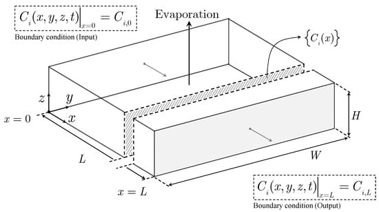 Having discussed above the complexity of modeling a solar evaporation pond, in the present paper, we introduce a surrogate mathematical model based on an ideal solar evaporation pond. The conceptualization of such a pond considers only evaporation excluding phenomena such as solids precipitation and entrainment, rainfall, and infiltration. Additionally, the model assumes that the rate of evaporation per unit area is uniform in the pond. Consequently, evaporation is directly proportional to the pond’s length (or area) and independent of the local concentration of species i or any other variable. The shape of the ideal pond is assumed to be an orthogonal parallelepiped with the top rectangular area exposed to solar radiation. Figure 3 illustrates a one-dimensional ideal solar evaporation pond, where the brine flow in the pond is unidirectional along its length, while maintaining a constant brine height, and the brine feed and discharge are continuous. Variables such as velocity and temperature are explicitly excluded, focusing solely on the concentration profile of species i along the pond’s length as the primary variable of interest.
