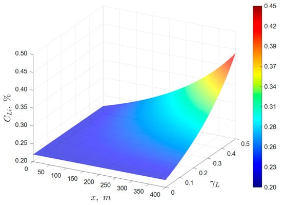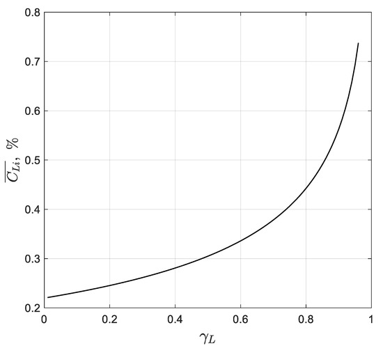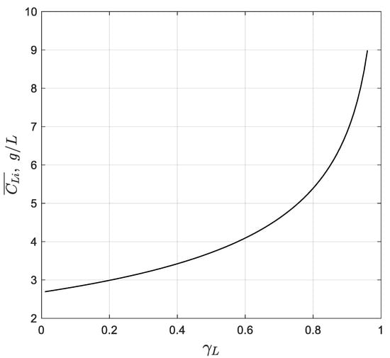 Therefore, using Equation (18), the average lithium concentration will be: Thus, for a given feed brine concentration, Equation (18) allows us to calculate the average concentration of a species in a pond for any value of . Then, considering a feed concentration of , the average lithium concentration in percentage as a function of is shown in Figure 8. On the other hand, considering a brine density of 1218 g/L, and a feed concentration of , a feed concentration of g/L is obtained. Thus, Figure 9 shows the resulting average lithium concentration in grams per liter as a function of .