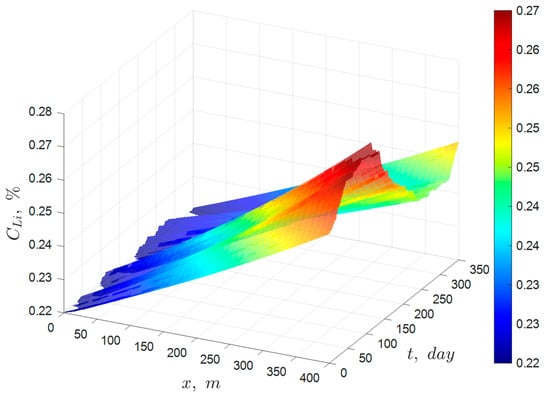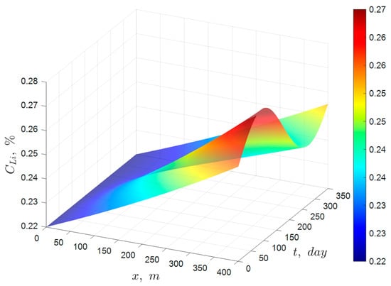 Therefore, the Li concentration profile in % along the length of the pond is given by