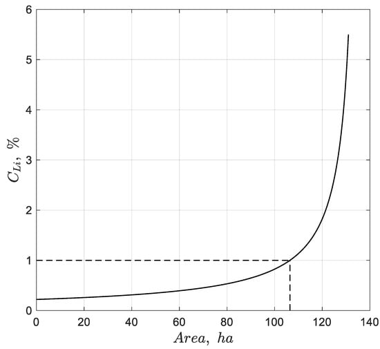 Let us consider that a pond with an area of 140,519 m2 was constructed, which was fed with a brine with a Li concentration of % and with a specific flow rate such that, at the steady state, the pond discharged a brine with a concentration of %. The objective is to estimate the required area for a system of ponds to discharge a final concentration of % Li. For these conditions, the following is obtained: