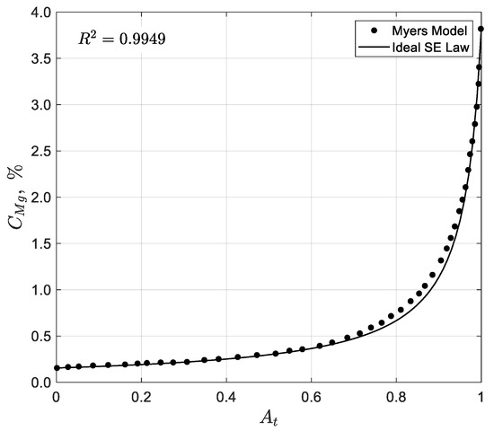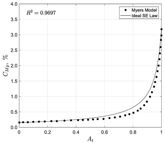 Figure 11 and Figure 12 compare the Mg concentration profile calculated using the ideal solar evaporation law to the Myers model for two different situations. As seen in Figure 11, the Myers model, under conditions of zero rainfall and infiltration, aligns well with the ideal solar evaporation with R2 = 0.9949. However, under conditions of maximum rainfall and infiltration, the model deviates from ideal behavior, exhibiting a shift toward non-ideal evaporation with R2 = 0.9697 (see Figure 12).