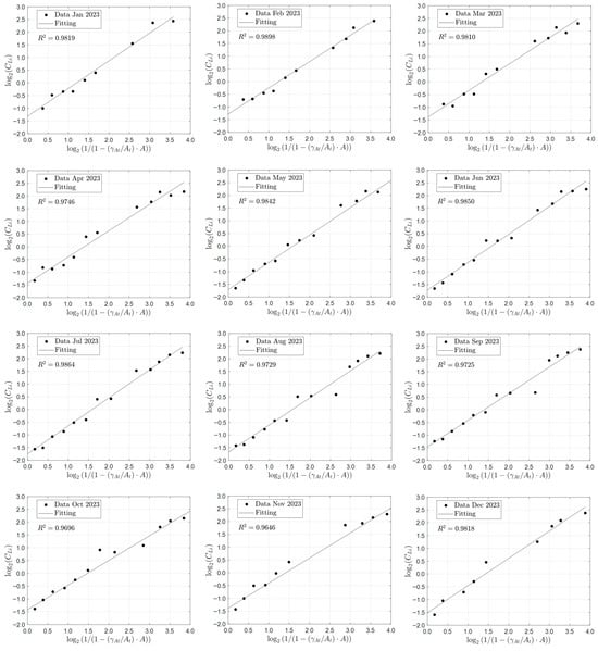 Although the ideal solar evaporation law was developed for an ideal pond that excludes infiltration, rainfall, and precipitation of the species of interest, it should be able to accurately predict the behavior of industrial solar ponds when applied to species that predominantly remain in solution. Therefore, the validation of the ideal solar evaporation law was carried out by comparing the model predictions with averaged monthly industrial data collected in the year 2023 from a pond system of 15 ponds arranged in series at one of Albemarle’s solar evaporation trains in the Salar de Atacama, Chile. The main species of interest in the brine were lithium, magnesium, and boron. The validation results for lithium are summarized below in Figure 13, which shows the comparison between the predictions of the ideal solar evaporation law and the experimental data for lithium from January to December 2023. The linear Equation (11) was used for the validation to better visualize deviations from a straight-line behavior and to protect Albemarle’s proprietary data. The good agreement observed (R2 in the range 0.9646 to 0.9864) indicated that low values of infiltration and rainfall in the industrial ponds do not affect appreciably the lithium concentration profile. Therefore, the ideal solar evaporation law can be used to accurately predict the concentration profile of lithium in an industrial evaporation pond system, and consequently, the lithium inventory of the system.