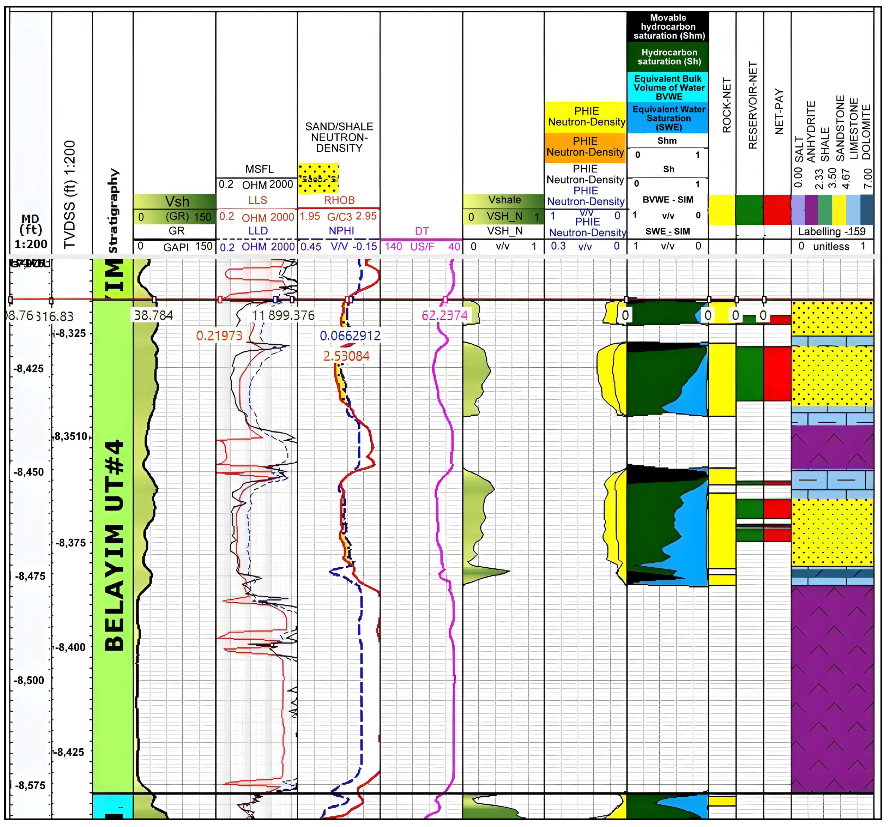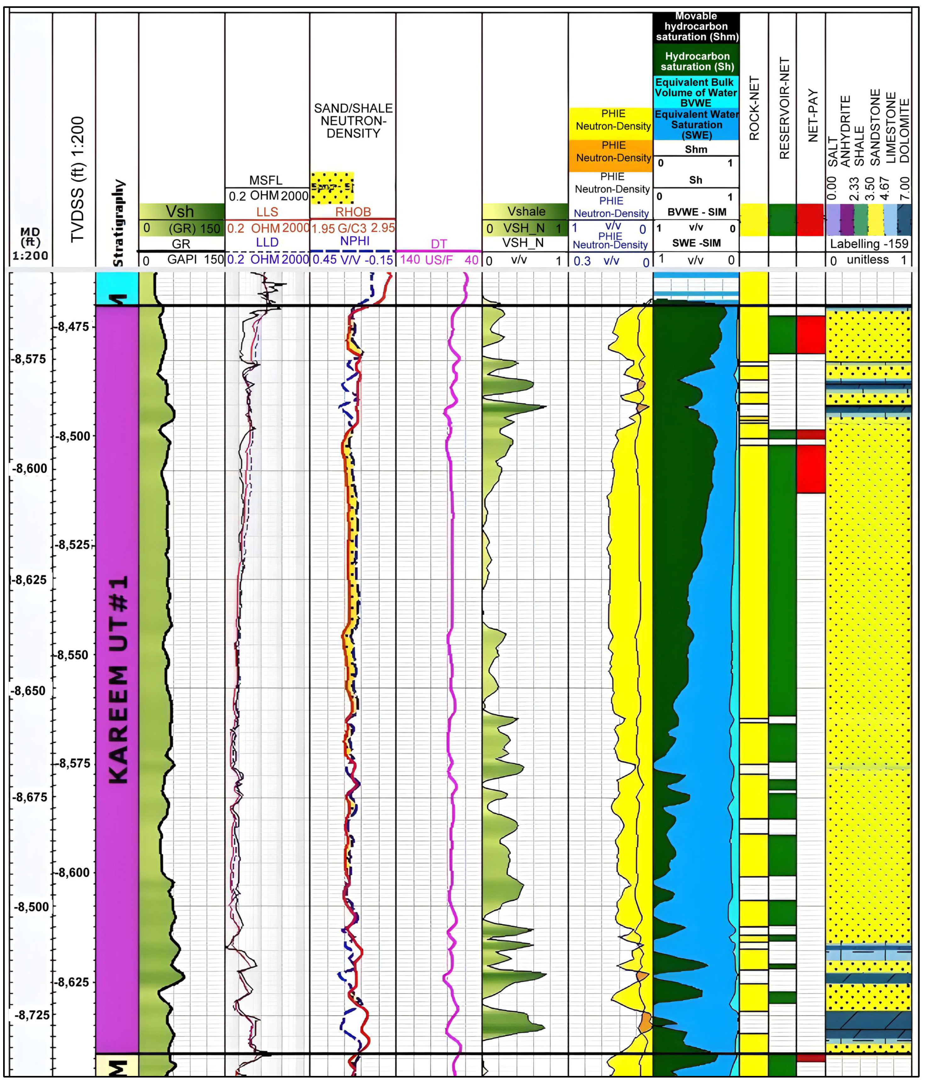 | Well Name | Reservoir Name | Gross (ft) | Net Reservoir (ft) | Net-Pay (ft) | Vsh (%) | ϕe (%) | Sw (%) |