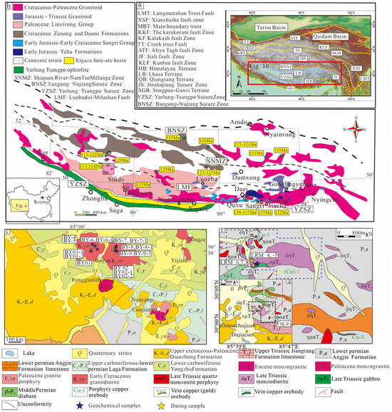 Distribution of magmatic rocks in the western Gangdese Belt. (a) Tectonic map of the Qinghai-Tibet Plateau and its adjacent areas; (b) Location map of the magmatic rock belt in the Lhasa Terrane []; (c) Sketch map of regional geology in the Boyun area; (d) Sketch map of regional geology in the Lurma area; (e) Sketch Map of the Lurma Composite Intrusion (Late Triassic-Early Cretaceous).
