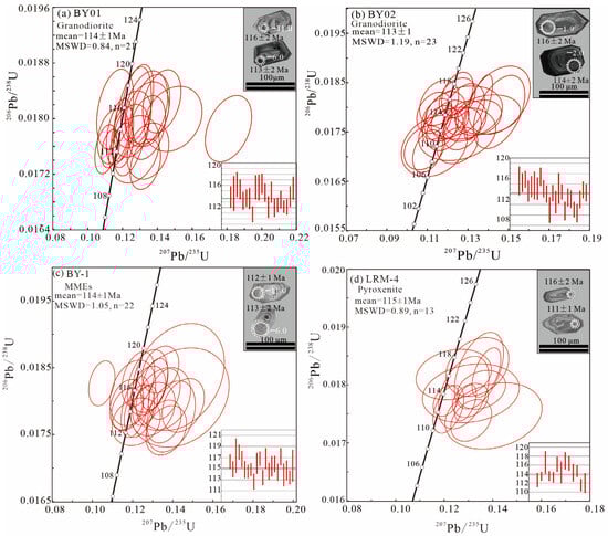The zircon U-Pb dating analysis included samples from two granodiorites (BY01, BY02), one MME (BY-2), and one pyroxenite (LRM-4). The results, detailed in Table 1, reveal that the zircons from all collected samples are predominantly euhedral and transparent, with typical oscillatory zoning CL textures. Their length to width ratios (1:1–5:1) (Figure 4a–d), are indicative of their magmatic origin []. Zircons extracted from the granodiorite samples (BY01, BY02) and gabbro diorite enclaves (BY-1) have high Th/U ratios (>0.3). These samples yield weighted mean 206Pb/238U ages of 114 ± 1 Ma, 113 ± 1 Ma, and 114 ± 1 Ma, respectively, placing their formation in the Early Cretaceous. Similarly, the zircons from pyroxenite (LRM-4) have high Th/U values (>0.7, see Table 1) and yield weighted mean 206Pb/238U ages of 115 ± 1 Ma.