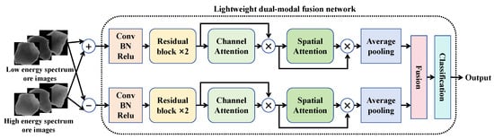 This section outlines the primary methodology of our ore separation algorithm. Specifically, to address the copper ore/waste rock sorting task in industrial settings, we propose a novel lightweight dual-tower CNN. This network performs feature learning and fusion, leveraging dual-energy spectral information for ore classification. The network comprises two parallel branches, each based on an identical convolutional neural network architecture, dedicated to processing data from both high- and low-energy spectra. The backbone of each branch integrates the improved residual modules and attention mechanism to enhance feature extraction. The algorithm’s overall framework is illustrated in Figure 1, and its components based on residual module and attenions will be elucidated in detail below.