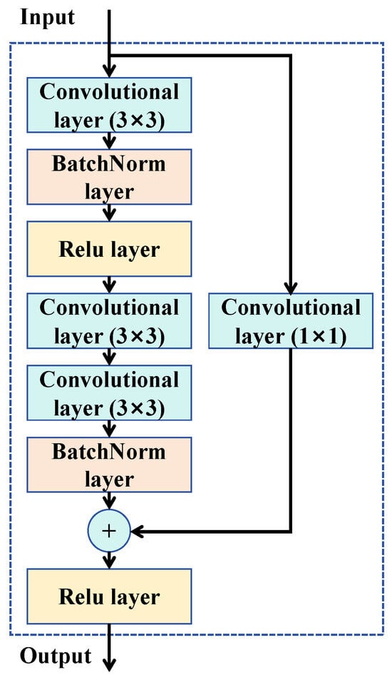 The well-known residual module, introduced by He et al. [], is predicated on directly propagating the input x to the output via an identity mapping. Concurrently, the network endeavors to learn a residual function designed to rectify any shortcomings in the input x. Consequently, the network’s output can be expressed as , where denotes the residual function, x represents the input, and y signifies the output. This module effectively mitigates issues such as vanishing and exploding gradients, thereby enhancing both the training speed and accuracy of the model.