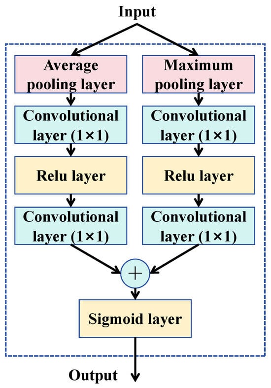 The channel attention mechanism, illustrated in Figure 3, initially computes the average and maximum values for each channel within the input feature map through adaptive average pooling and max pooling, respectively, thereby capturing global channel-wise information. These pooled features subsequently undergo compression via a convolutional layer, followed by a ReLU activation to introduce nonlinearity. Subsequently, an additional convolution restores the original channel dimension, yielding channel-wise weights. The weights derived from both average and max pooling are then summed to acquire comprehensive channel importance scores, which are subsequently normalized to the range using a sigmoid activation function. This channel attention map is then multiplied element-wise with the original feature map, thereby enhancing salient features while attenuating less informative ones. The entire process can be represented as follows: