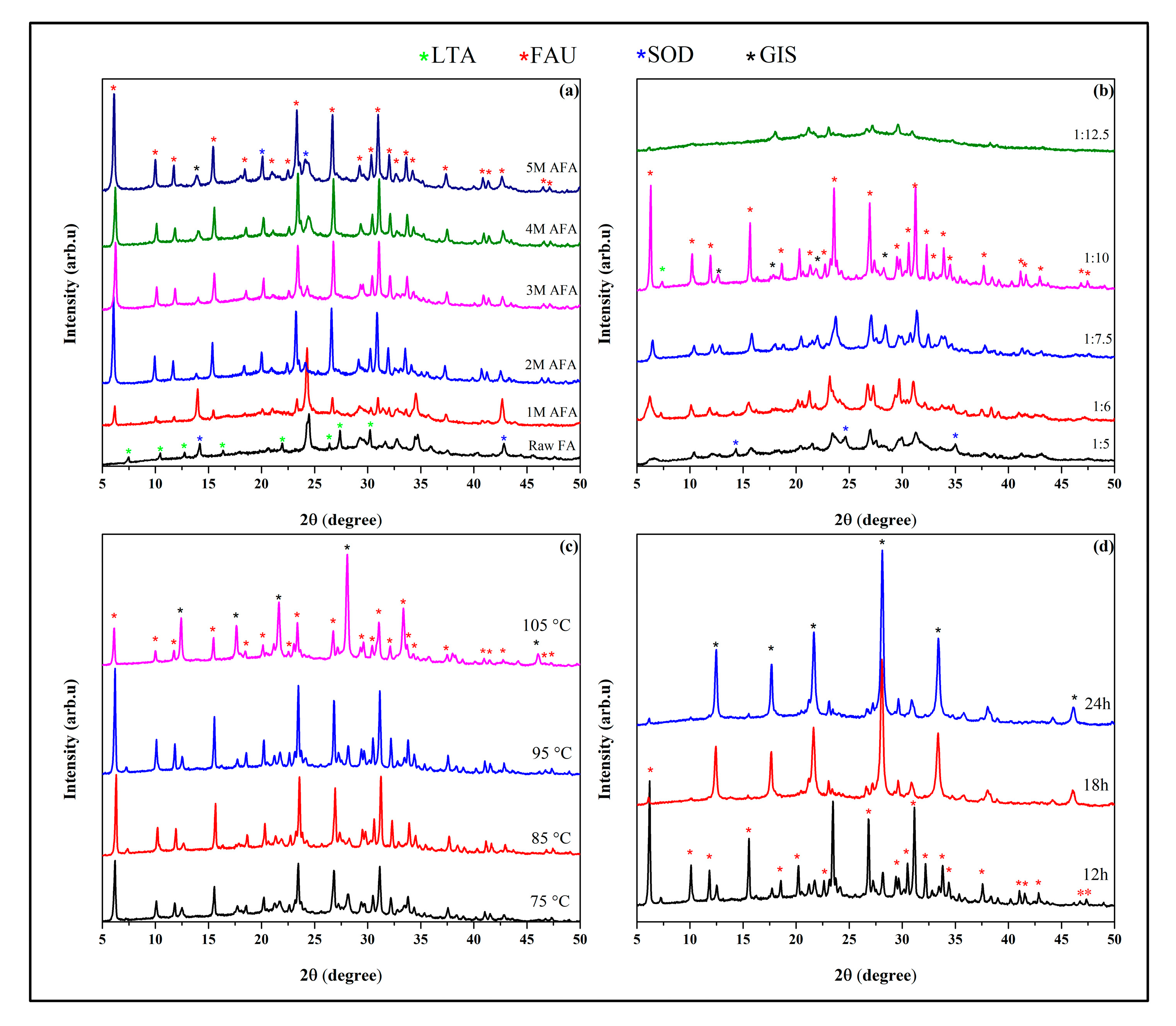 | Zeolites | Gel Composition (FA:KOH:NaOH:H2O) | Temperature (°C) | Synthesis Time (h) |
