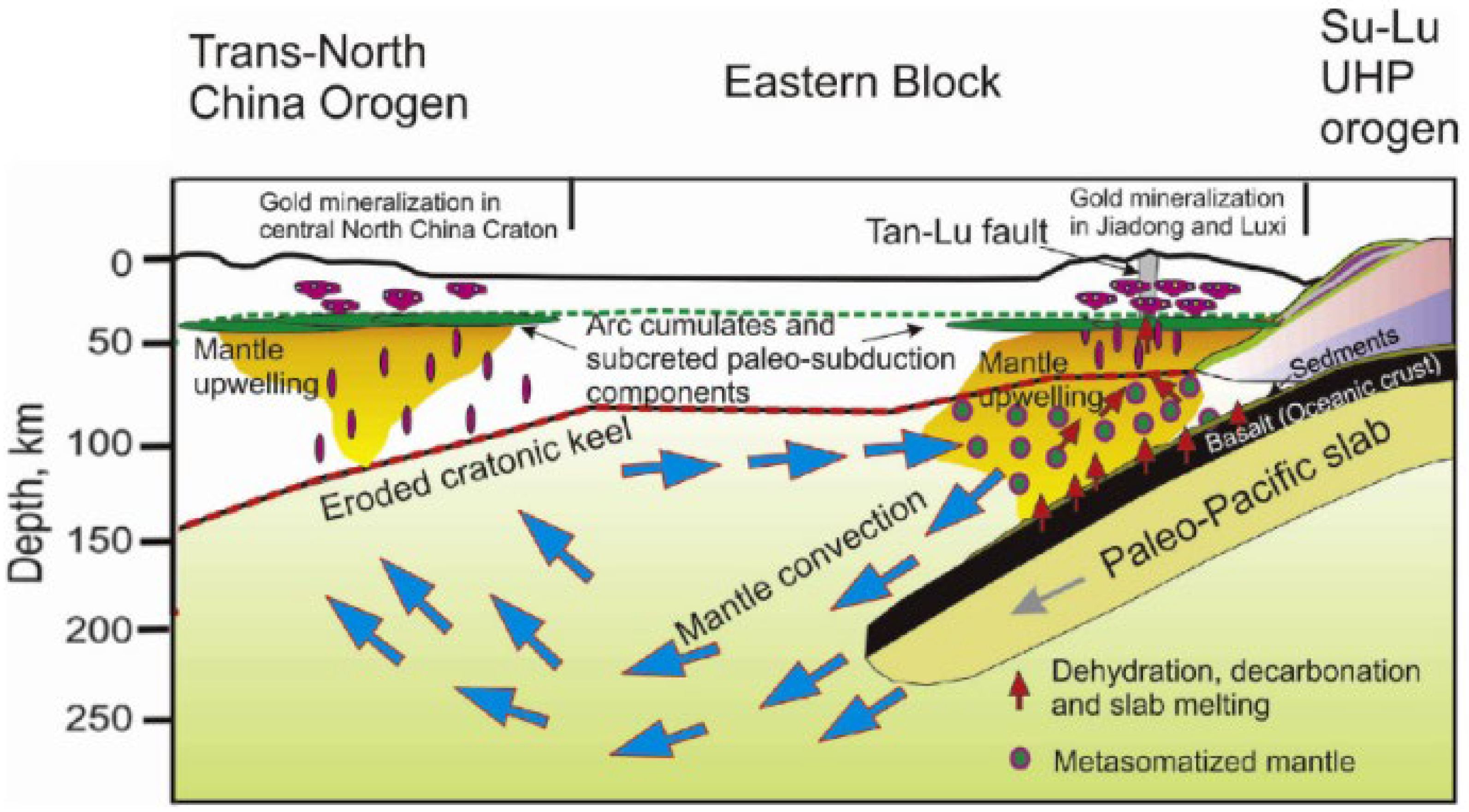 - Zhu, G.; Jiang, D.; Zhang, B.; Chen, Y. Destruction of the Eastern North China Craton in a Backarc Setting: Evidence from Crustal Deformation Kinematics. Gondwana Res. 2012, 22, 86–103. [Google Scholar] [CrossRef]