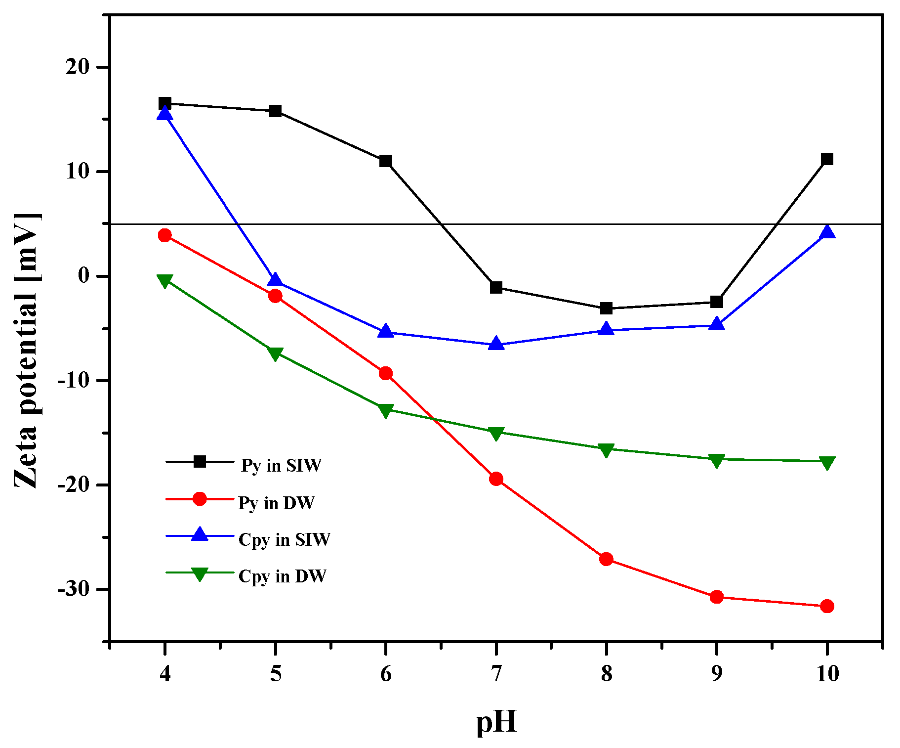 Figure 4 compares the evolution of the zeta potential (ζ) of chalcopyrite (Cpy) and pyrite (Py) between pH 4–10 in distilled water (DW) and in the SIW. As shown in