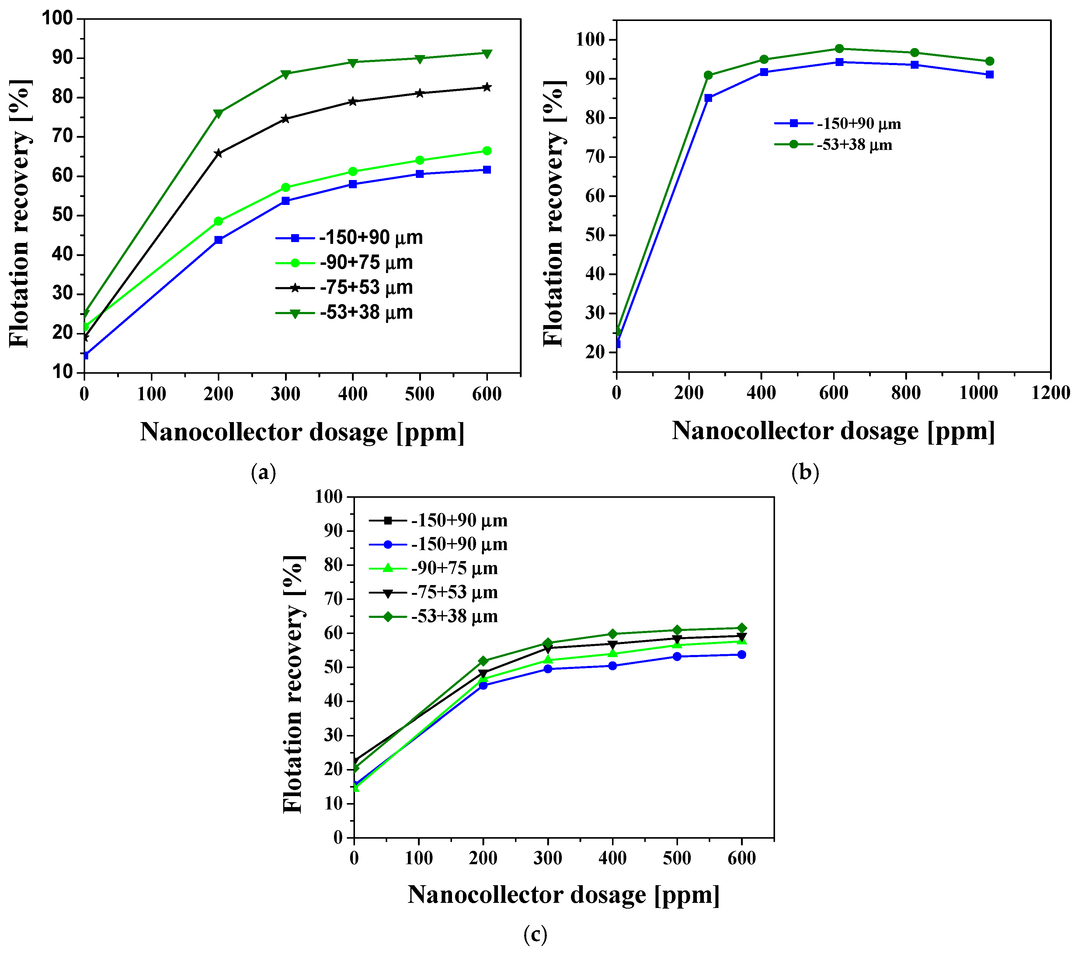 Figure 7a). In the first, between 0 and 4 ppm PAX, all fractions improve sharply: the −150 + 90 µm and −90 + 75 µm particles reach ≈97%–99% at only 2–4 ppm, while the −75 + 53 µm fraction reaches 90% at 8 ppm. This rapid increase reflects the fact that xanthate adsorption kinetics is very efficient for particles ≥ 53 µm: a single monolayer is sufficient to ensure stable bubble–particle collision and adhesion.