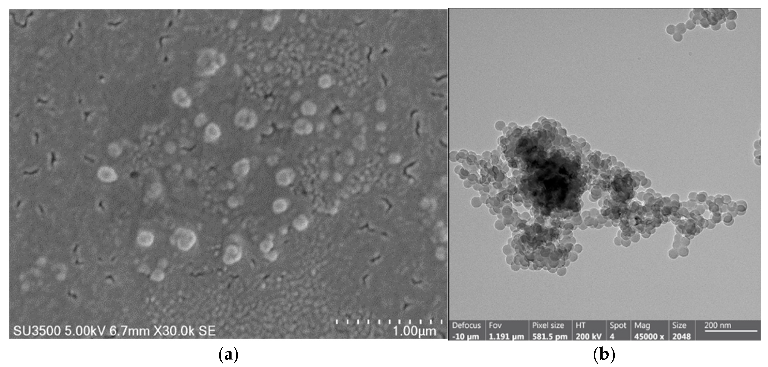 3.6. Morphological Analysis of Nanoparticles by SEM-EDX and TEM