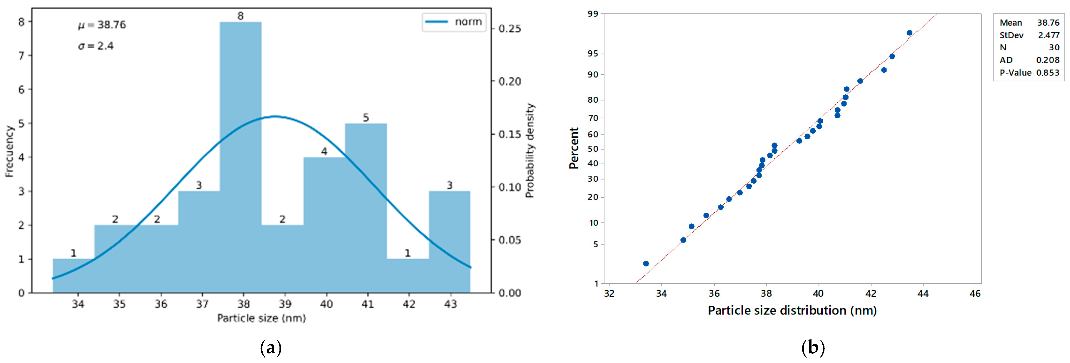 The histogram (a), based on the analysis of 30 PS-DVB-CTAB-PAX nanoparticles, reveals a moderately narrow distribution with particle sizes ranging from 33.37 nm to 43.48 nm. Most particles cluster around the mean value of 38.8 nm with a standard deviation of 2.4 nm, indicating low dispersion and suggesting a consistent synthesis process. Moreover, the Q-Q plot (b) confirms a good fit to normality (p-value = 0.853).
