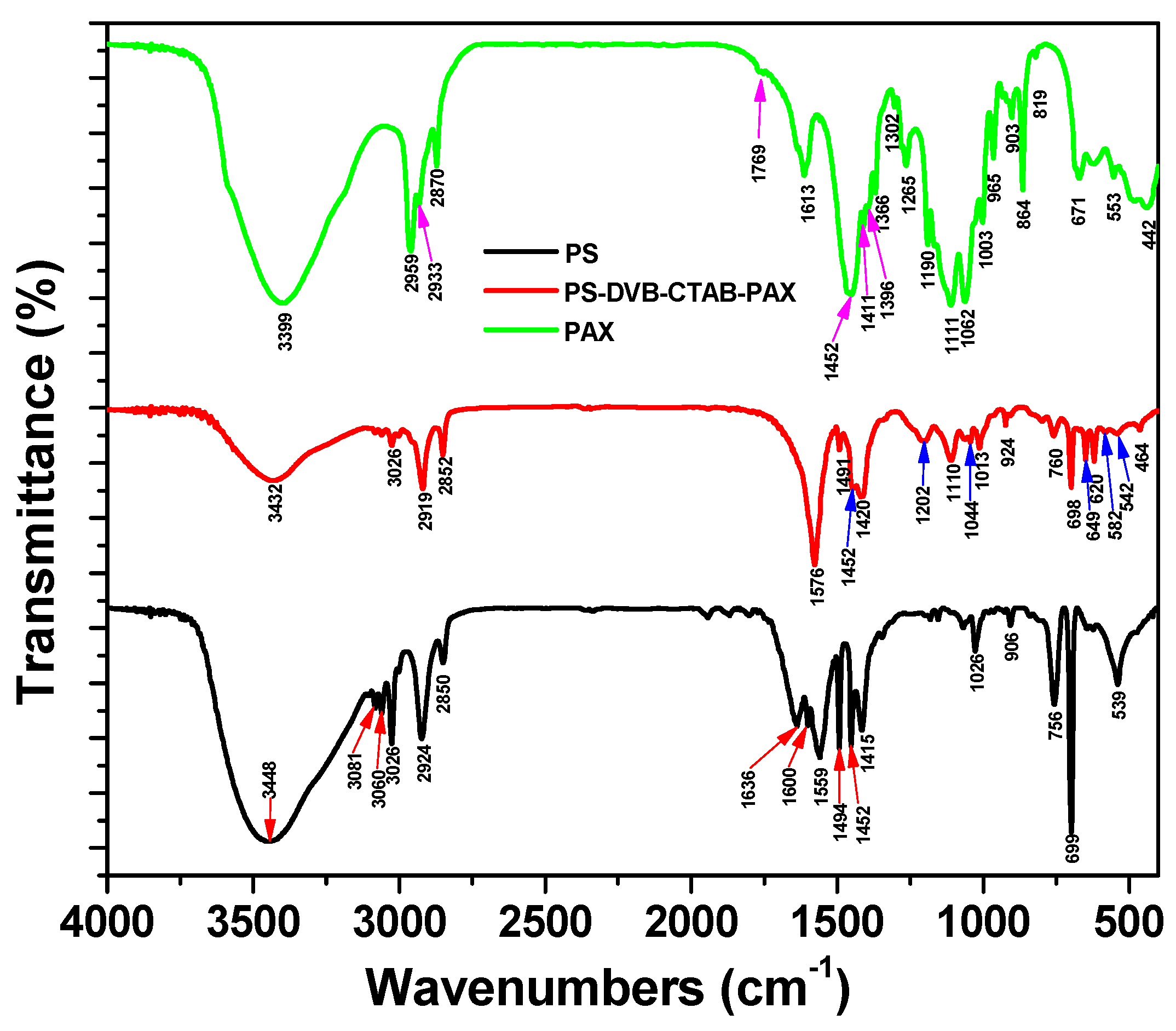 Figure 13 compares the spectra of polystyrene (PS), the PS-DVB-CTAB-PAX copolymer, and the PAX reagent. The PS spectrum exhibits characteristic signals in the regions of 3000–3100 cm