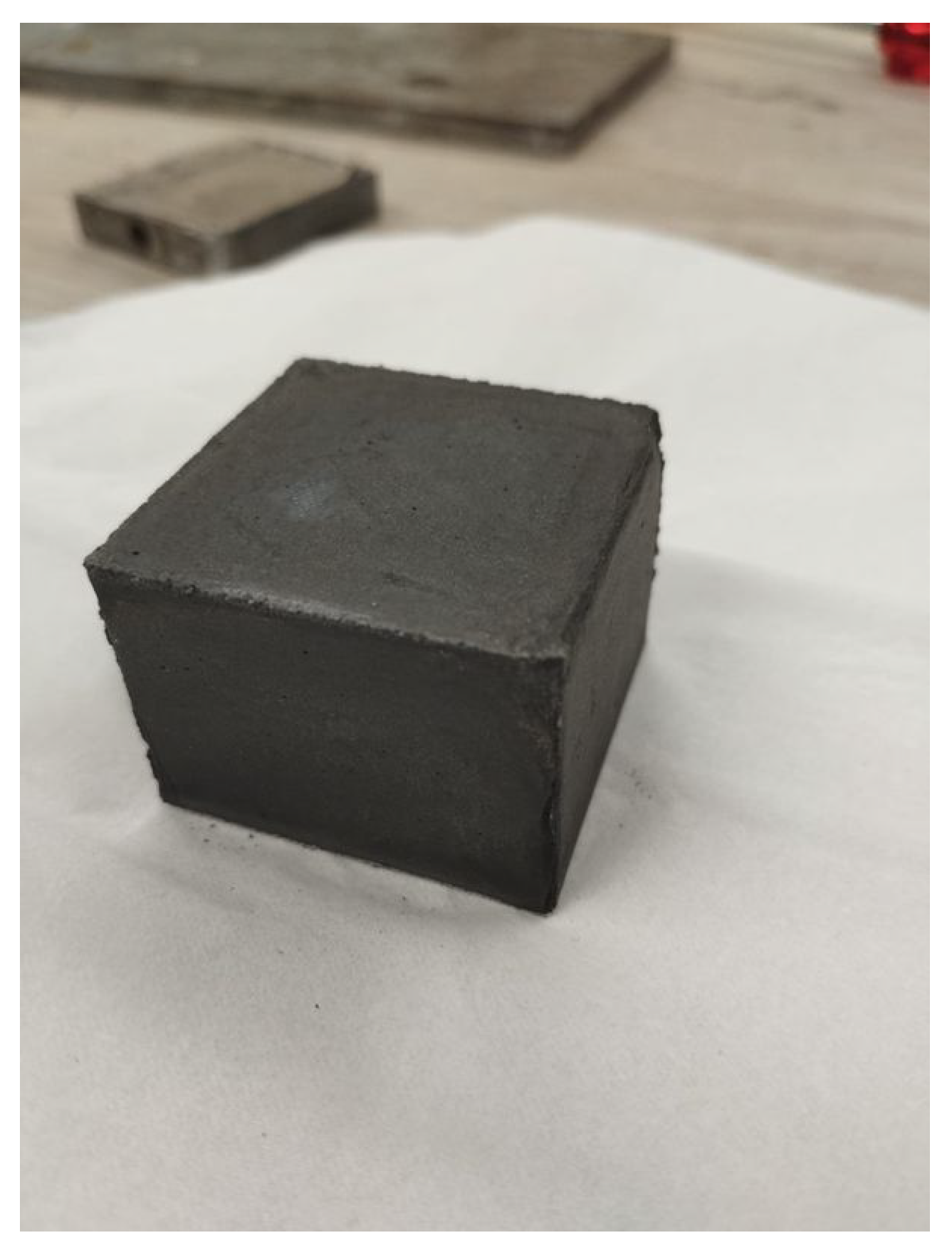 Demolded Aachen GP cubic specimen (40 × 40 × 40 mm) prior to curing used for compressive strength testing and other analysis.