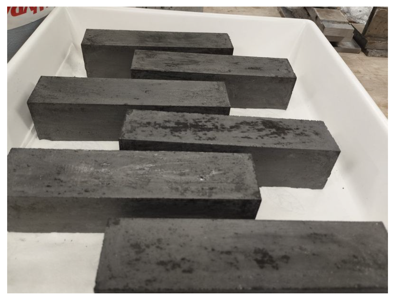 Demolded Aachen GP prismatic specimens (40 × 40 × 160 mm) prior to curing used for flexural strength testing.