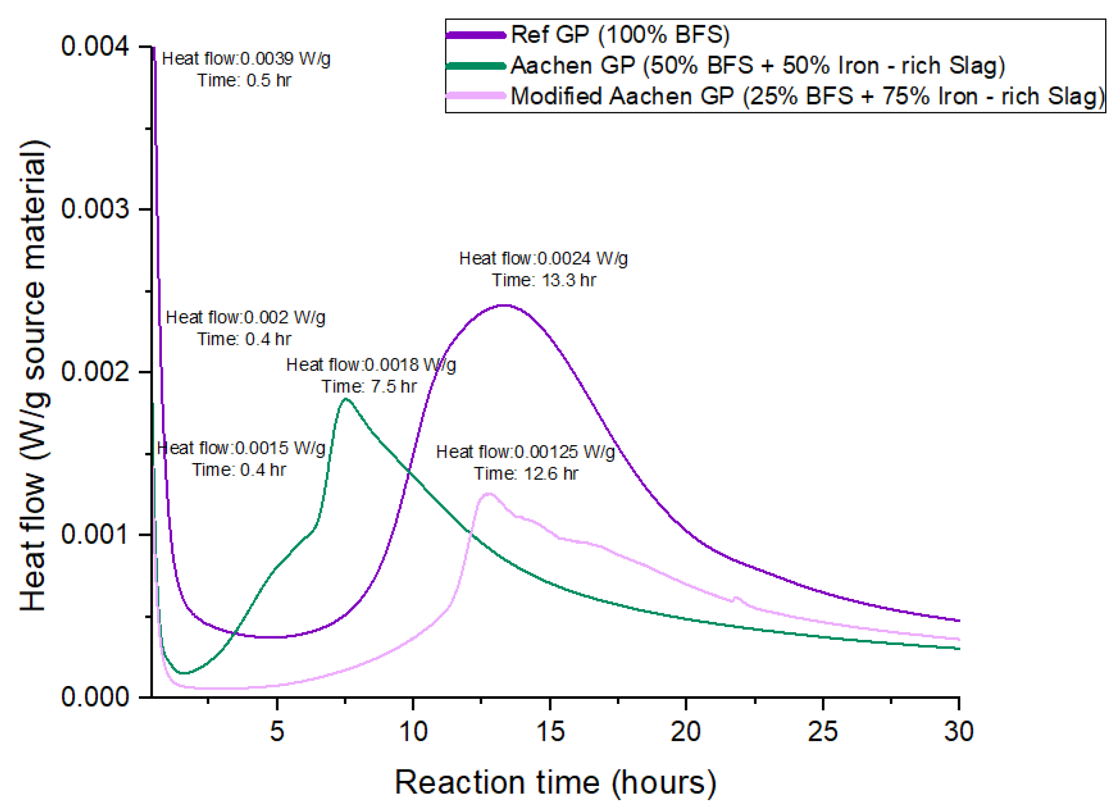 Heat flow curves of alkali-activated materials (AAMs) during isothermal activation, showing full heat evolution over 15 days, the first exothermic peak, and the second acceleration peak for Ref GP, Aachen GP, and Modified Aachen GP. The purple line represents Ref GP (100% BFS), the green line represents Aachen GP (50% BFS + 50% iron-rich slag), and the pink line represents Modified Aachen GP (25% BFS + 75% iron-rich slag).