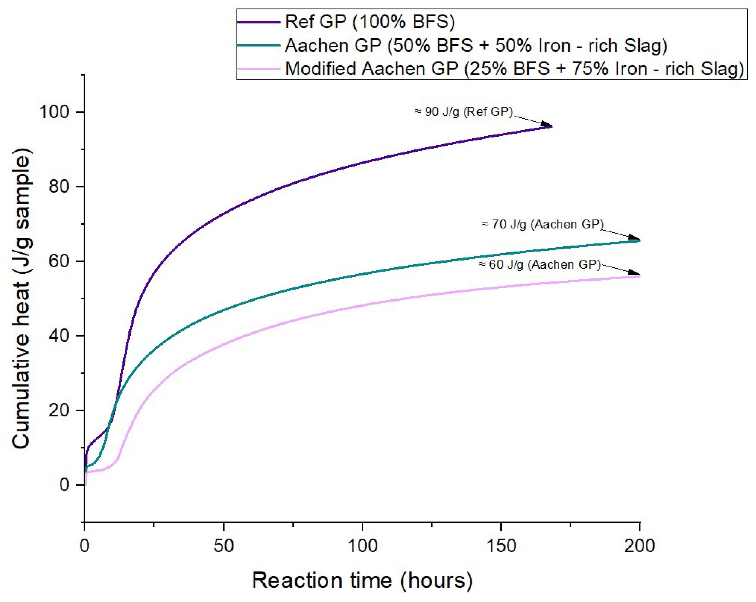 Cumulative heat release of alkali-activated materials (AAMs) during isothermal activation over 15 days. The purple line represents Ref GP (100% BFS), the green line Aachen GP (50% BFS + 50% iron-rich slag), and the pink line Modified Aachen GP (25% BFS + 75% iron-rich slag). Labeled values indicate the final cumulative heat (J g−1) for each formulation, showing a progressive reduction in reaction extent with increasing iron-slag content.