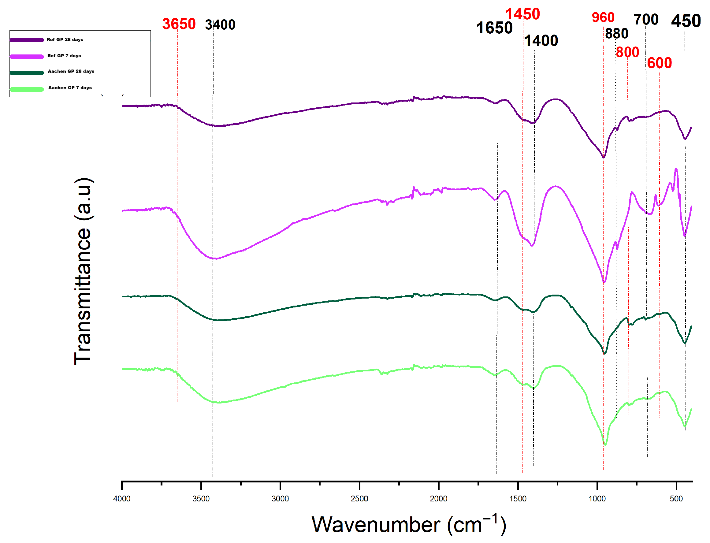 ATR-FTIR spectra of Ref GP and Aachen GP at 7 and 28 days, vertically shifted to aid visualization. The image shows the evolution of Si–O–T, Fe–O, and carbonate vibrations during alkali-activation.